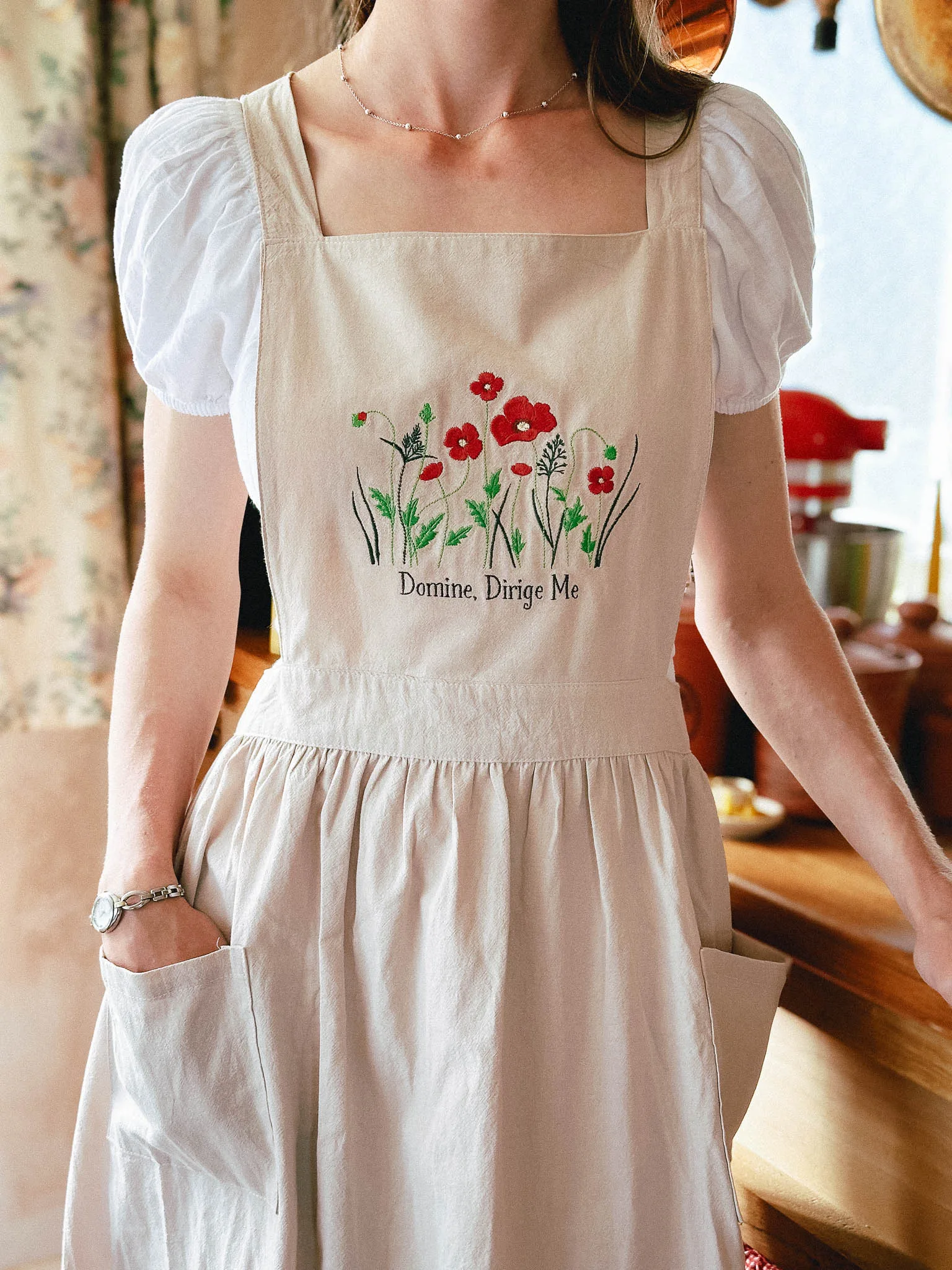 Our storyInspired by Our Lady, this apron is lovingly embroidered with the words ‘Gratia Plena, Dominus Tecum’ (Full of Grace, the Lord is with Thee) to remind Catholic women of the beauty of the domestic realm.
