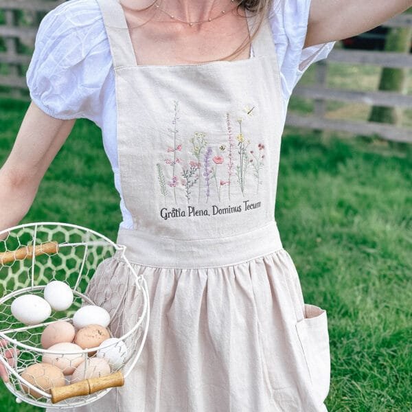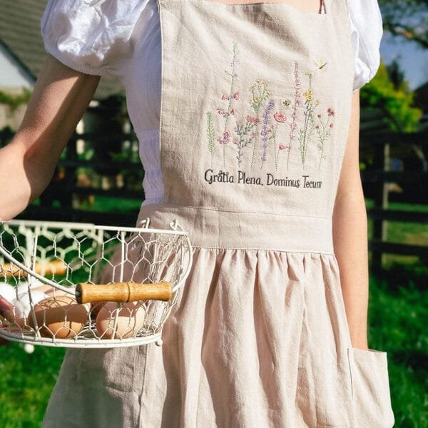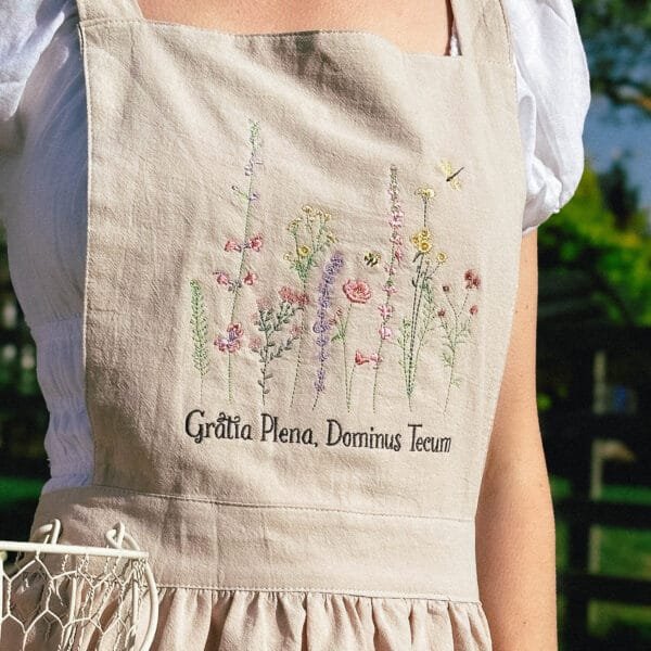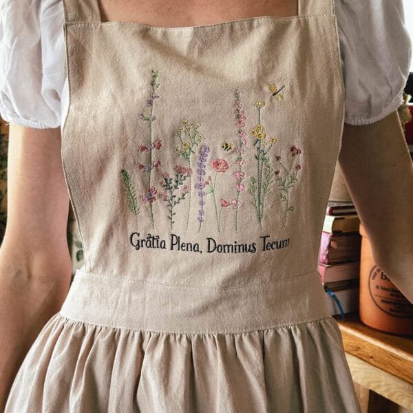 Inspired by the quiet grace and strength of the Blessed Virgin Mary, this Apron dress features delicate wildflower embroidery and the sacred words “Gratia Plena, Dominus Tecum”(Full of Grace, the Lord is with Thee).