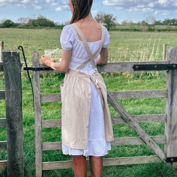 Crafted in a soft cream-colored linen cotton blend, the apron combines timeless design with functional comfort. The cross-strap and tie waist ensure a flattering and feminine fit for all body types, while the two generously sized front pockets add practicality (perfect for tidying up after little ones or keeping your rosary on hand as you cook dinner).